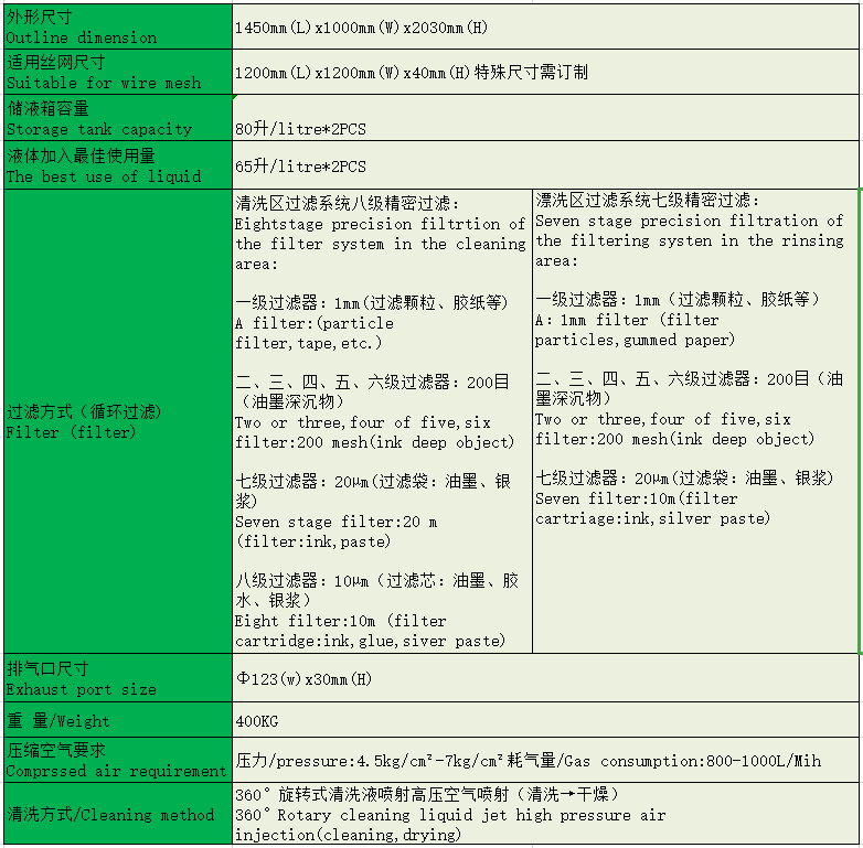 此款设备适用于大型丝网、钢网、铜网、胶网、微孔网等各类网版的清洗。设备采用纯压缩空气驱动隔膜泵,使清洗液在机器里面循环使用,可达到清洗剂零排发。