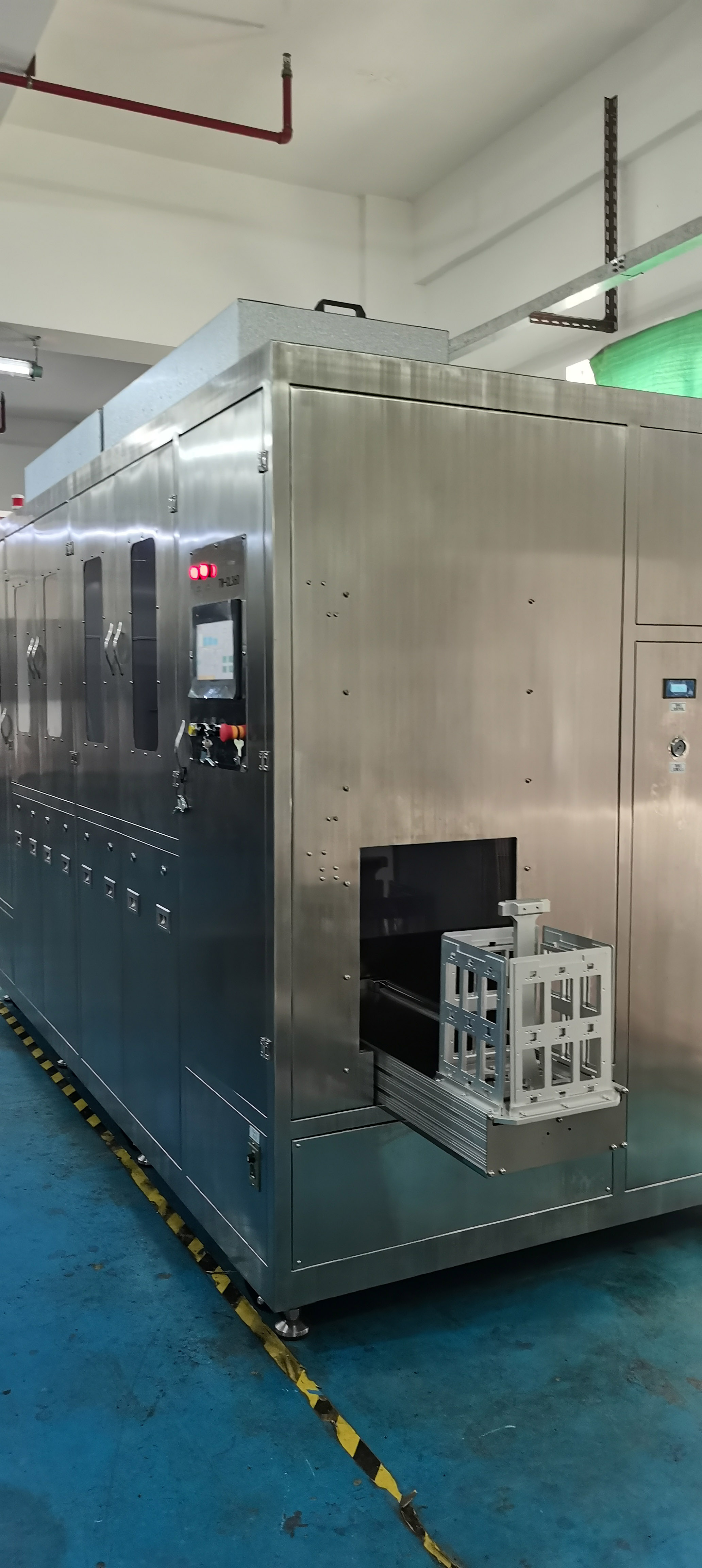 在线式提篮喷淋清洗机是一款专门为半导体产品清洗而开发的设备。设备拥有独特的旋转喷淋以及多槽式震动漂洗功能,各清洗段落配置有精密的过滤装置,机器顶部安装FFU过滤器,整体确保了机器运行过程中的洁净度。